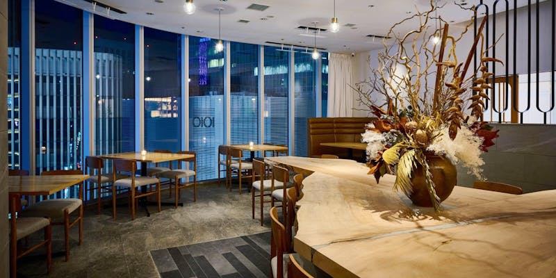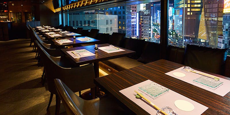 窓越しに浜離宮恩賜庭園を望むパノラマビューが広がる、墨絵をモチーフに蔵をモダンに表現したインテリアが特徴の地上28階の店内。